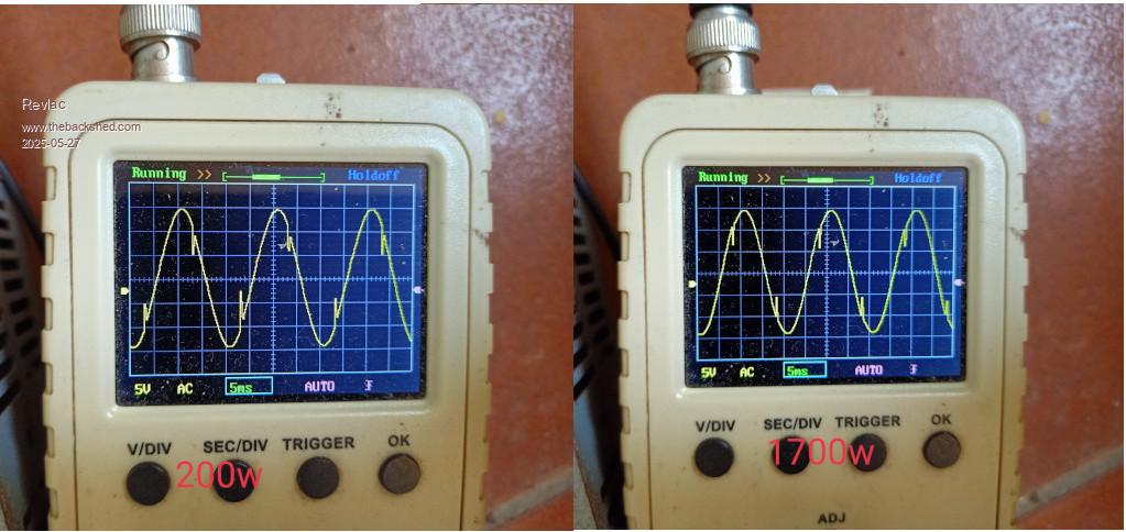 The first photo is the speed controller running a restive load at 200w  the second photo is at 1700w the divot moved from one side over the peak of the wave to the other side, the inverter runs this just fine, no change in sound from the toroid and no other loads running, turn the controller all the way up and the divot is gone.