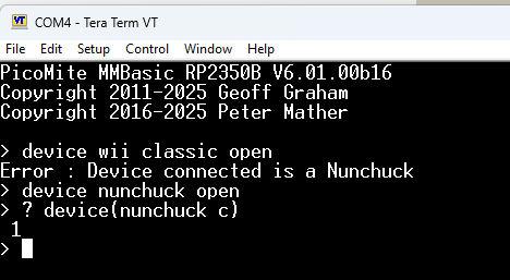 @Peter, Have you ever been able to find out what causes the issue with the 2 WII controllers ? When you open a WII classic, but have a WII nunchuck connected, it gives an error message. When you next try to open a WII nunchuck, it says this is not possible (the channel is open). Closing the classic in between does not help (the channel is already closed). Do the reverse When you open a WII nunchuck, but have a WII classic connected, it gives an error message. When you next try to open a WII classic, that works. I already use a work around (doing the I2C in MMBasic) but I was curious if you ever found out why. I think this was on b11. Volhout PicomiteVGA PETSCII ROBOTS |