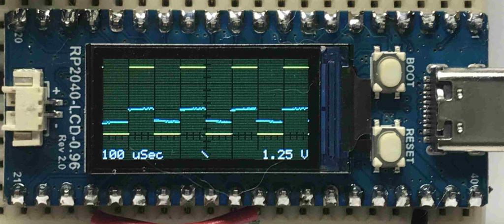 Mick: Mission accomplished! Here's a two trace scope. At the moment, triggering is only done on Channel 1, and the fastest time has dropped from 50 uSec to 100 uSec. (Pin 31 wired to test signal; pin 32 is floating) I had been thinking about how to do it this morning, and figured that my first whack at it would fail due to too much memory usage (second buffers for both the raw signal and the displayed trace), but wouldn't you know it, it worked first time out. What a wonderful environment to code in! ' TwoTrace - a 2-channel oscilloscope on the RP2040-LCD-0.96 ' Steve Johnson September, 2023 ' ' Analog Signal input 1 on GP26 / Pin 31 - trace 1 / trigger ' Analog Signal input 2 on GP27 / Pin 32 - trace 2 ' Test Signal output on GP18 / Pin 24 ' ' Scope controls via momentary contact switches to ground ' Vertical Scale switch on GP13 / Pin 17 ' Trigger Select switch on GP14 / Pin 19 ' Time Scale switch on GP15 / Pin 20 ' ' Scope Controls (via serial input from terminal emulator): ' Voltage: {0}, {1}, {2} to change vertical scale ' Time: {F}aster, {S}lower to change horizontal scale ' Trigger: {U}p, {D}own, {N}one to change trigger criteria ' ' Sampling, Test Signal, Triggering, Framebuffers from stanleyella ' Math & Memory Copy from matherp ' Ganssle's switch debounce routine from CaptainBoing and Steve Johnson ' Graticules, Array Drawing, variable scales & triggering from Steve Johnson ' Interrupt Service Routines from Steve Johnson Option EXPLICIT ' Specifically For Waveshare RP2040-LCD-0.96 Const Hres = MM.HRes ' Horizontal screen resolution Const Vres = MM.VRes ' Vertical screen resolution Const Major = Vres/4 ' Major tic mark pixel spacing Const Minor = Major/4 ' Minor tic mark pixel spacing Const PWM_Pin = MM.Info(PINNO GP18) ' Pin 24 - PWM Test signal output pin Const ADC1_Pin = MM.Info(PINNO GP26) ' Pin 31 - Analog to Digital Converter 1 Const ADC2_Pin = MM.Info(PINNO GP27) ' Pin 32 - Analog to Digital Converter 2 Const V_sw = MM.Info(PINNO GP13) ' Pin 17 - Vertical Scale pushbutton switch Const T_sw = MM.Info(PINNO GP14) ' Pin 19 - Trigger Select pushbutton switch Const A_sw = MM.Info(PINNO GP15) ' Pin 20 - Time Scale pushbutton switch Const PWM_Freq = 5000 ' Frequency for Test Signal on Pin 24 Const PWM_Duty = 49 ' Base duty cycle for test signal PWM in % Const PWM_Jitter = 2 ' Jitter in % for test signal PWM Const Debounce = 200 ' Debounce delay in mSec for front panel switches ' Generic to all displays - calculations done off screen dimensions Const HMajor = Hres/Major ' How many Horiz Major Tic marks Const VMajor = Vres/Major ' How many Vert Major Tic marks Const HMinor = Hres/Minor ' How many Horiz Minor Tic marks Const VMinor = Vres/Minor ' How many Vert Minor Tic marks Const Background = RGB(32,64,32) ' Color for Display background, a la Tektronix scopes Const GMajor = RGB(black) ' Color for Major tic marks Const GMinor = RGB(black) ' Color for Minor tic marks Const T1_color = RGB(yellow) ' Color for displayed Trace1 Const T2_color = RGB(cyan) ' Color for displayed Trace2 Const TxtColor = RGB(white) ' Color for displayed text Const ShadColor = RGB(black) ' Color for text shadows Const Trig_None = 0 Const Trig_Down = 1 ' Enumerate possible trigger conditions Const Trig_Up = 2 Const ADC_Max = 7 ' Maximum index into ADC Time Scale array (0-6) Const V_Max = 3 ' Maximum index into Voltage Scale array (0-3) Const Trig_Max = 2 ' Declare storage Dim INTEGER c, n, x, y, trigger, trigger_timeout, Vselect, Trig_Type, ADC_select Dim INTEGER v_time, v_diff, v_state, v_old, v_press ' Volts scale button debouncing and status Dim INTEGER t_time, t_diff, t_state, t_old, t_press ' Trigger type button debouncing and status Dim INTEGER a_time, a_diff, a_state, a_old, a_press ' ADC frequency button debouncing and status Dim INTEGER Horizontal(Hres) ' Horizontal coordinate buffer for fast graticule and buffer draw Dim FLOAT trace1(2*Hres) ' Extra size to hopefully pick up a trigger event Dim FLOAT trace2(2*Hres) ' Extra size to hopefully pick up a trigger event Dim FLOAT buffer1(Hres) ' Display buffer for screen output Dim FLOAT buffer2(Hres) ' Display buffer for screen output Dim INTEGER addr.trace1, addr.trace2, addr.buffer1, addr.buffer2 Dim INTEGER HMajorX1(HMajor+1), HMajory1(HMajor+1), HMajory2(HMajor+1) ' For Horizontal Major Axes Dim INTEGER VMajorX1(VMajor+1), VMajorx2(VMajor+1), VMajory1(VMajor+1) ' For Vertical Major Axes Dim INTEGER HMinorX1(HMinor+1), HMinory1(HMinor+1), HMinory2(HMinor+1) ' For Horizontal Minor Axes Dim INTEGER VMinorX1(VMinor+1), VMinorx2(VMinor+1), VMinory1(VMinor+1) ' For Vertical Minor Axes Dim Float V.Scale(10), V.Offset(10), V.MajVolts(10) Dim Float H.Freq(10), H.Seconds(10) Dim String H.Units$(10), keypress$ ' ========================== Initialization ================================= Timer = 0 Initialize_Arrays Initialize_Hardware Display_Instructions Draw_Graticules ' ========================== Processing Loop ================================ Do Randomize_Test_Signal trigger_timeout = Timer Do Handle_Keypresses Handle_Switches trigger = -1 Get_Samples trigger = find_trigger(Trig_Type) If Timer-trigger_timeout > 2500 Then Display_No_Trigger ' Waiting too long for a trigger. Loop Until trigger >= 0 If Timer-trigger_timeout > 2500 Then Draw_Graticules ' OK, we've got a trigger. Clear message. Scale_Samples Update_Display Loop ' ========================== Interrupt Service Routines ==================== Sub V_ISR ' Interrupt Service Routine for Voltage SPST Button If v_press = 0 Then ' Ignore further button presses until handled in main loop If (Timer - v_time) > debounce Then v_press = 1 : v_time = Timer EndIf End Sub Sub T_ISR ' Interrupt Service Routine for Trigger SPST Button If t_press = 0 Then ' Ignore further button presses until handled in main loop If (Timer - t_time) > debounce Then t_press = 1 : t_time = Timer EndIf End Sub Sub A_ISR ' Interrupt Service Routine for ADC Frequency SPST Button If a_press = 0 Then ' Ignore further button presses until han