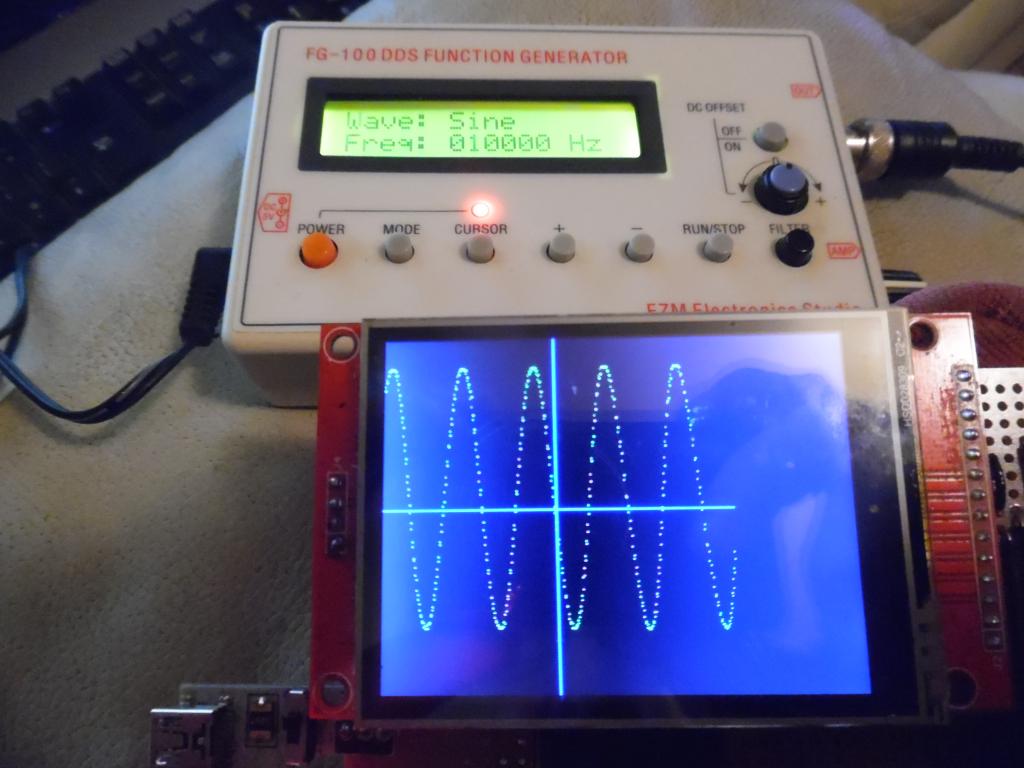 I got XR2206-based (but exceedingly crappy) "signal generator" as well. they messed the circuit for cheapness but it can sweep freq which tests a scope. I posted this over a tear ago using lcd and 2 adc in but no 90 deg sines. Mean time I changed my simple scope from line to pixel. Dunno if I like pixel,I'll sort a sine. Trigs ok. guess it's faster than line. for x%=0 to 238 'screen width 'line x%,samples!(x%+c%),x%+1,samples!(x%+1+c%),,rgb(green) 'draw new sample from sample(c%) pixel x%,samples!(x%+c%),rgb(green) 'plot new sample from sample(c%) next x% |