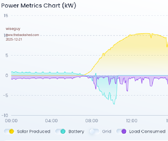 Here is a picture of the Sig information graph. The green is battery energy being used, the lower purple is shown as energy for the house. Look at 6am and you will notice a decline of battery energy supplied to zero at about 7:30 as the solar is now reported to have started generation.