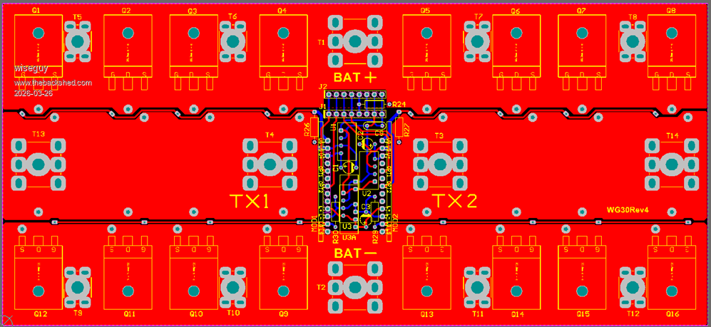The result is that the high current paths for all the FETs travel from ~15 to ~20 mm less PCB trace distance to the high current connectors too.