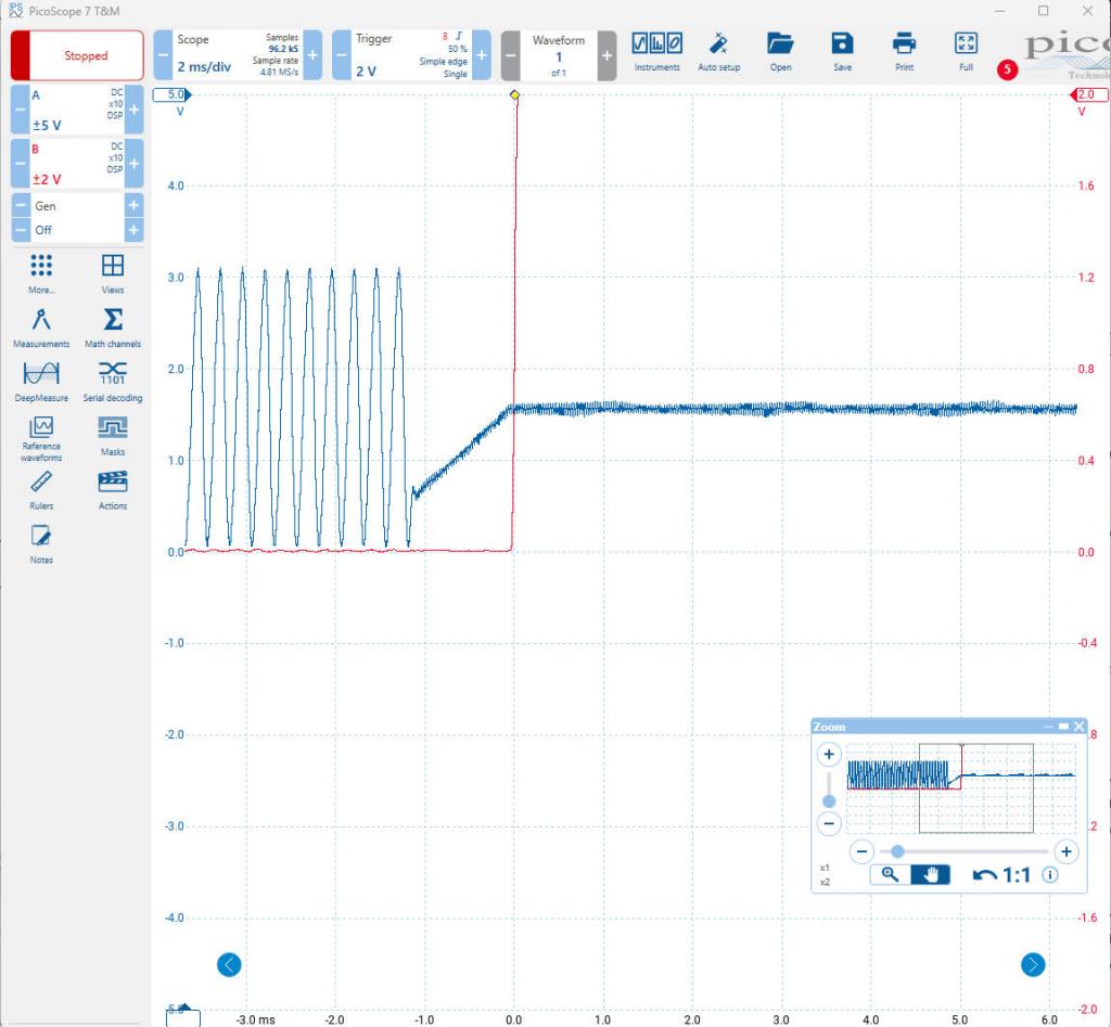 Sorry Homa, I have to disagree to some point. The PLAY TONE is perfect. PLAY WAV and PLAY FLAC are not always. If feels a bit as if the actual audio sample value has impact on the behaviour. Pictures from a different scope. Sometimes PLAY STOP is almost perfect. Here a single audio sample is wrong. This is almost inaudible. ![]() Sometimes it is perfect. Like the soft return to 50:50 when playing tone. But sometimes it is not. ![]() Looking at the PLAY TONE (that always works perfect), the correction is always from values <2000 to 2000 (slope upwards). Also if I look at the waveforms Homa send: the correction is always with a rising slope. If you look at the above picture, the value of the signal is >2000, and should ramp downward to 2000 (falling slope). Is that the problem ? Volhout PicomiteVGA PETSCII ROBOTS |