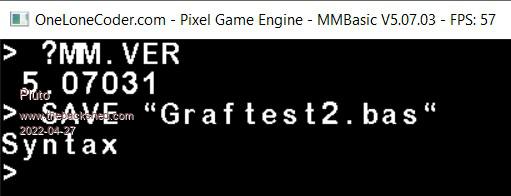 V5.07.03b10: Running a testing program "Graftest.bas". OK Trying to save a copy of the program as "Graftest2.bas". NOK ![]() Program stored in the default MMBasic directory. I am probably doing some stupid mistake. Need advice. /Fred |