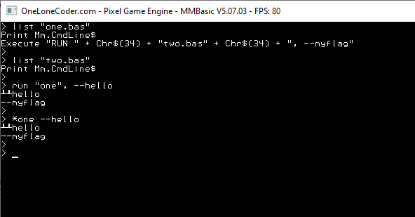 Hi Peter, I'm back on MMB4W for a couple of days, here's a bug for you that I'm suprised I didn't notice previously: ![]() Observe that the hyphens passed from the prompt are not handled correctly (I'm guessing they are being converted into tokens), but those passed via EXECUTE are. I vaguely recollect that the CMM2 had the same issue but that you kindly fixed it for me. Best wishes, Tom Edited 2022-06-03 19:28 by thwill MMBasic for Linux, Game*Mite, CMM2 Welcome Tape, Creaky old text adventures |