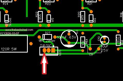 Can you measure at the pin of the TIP31 pointed to by the arrow?