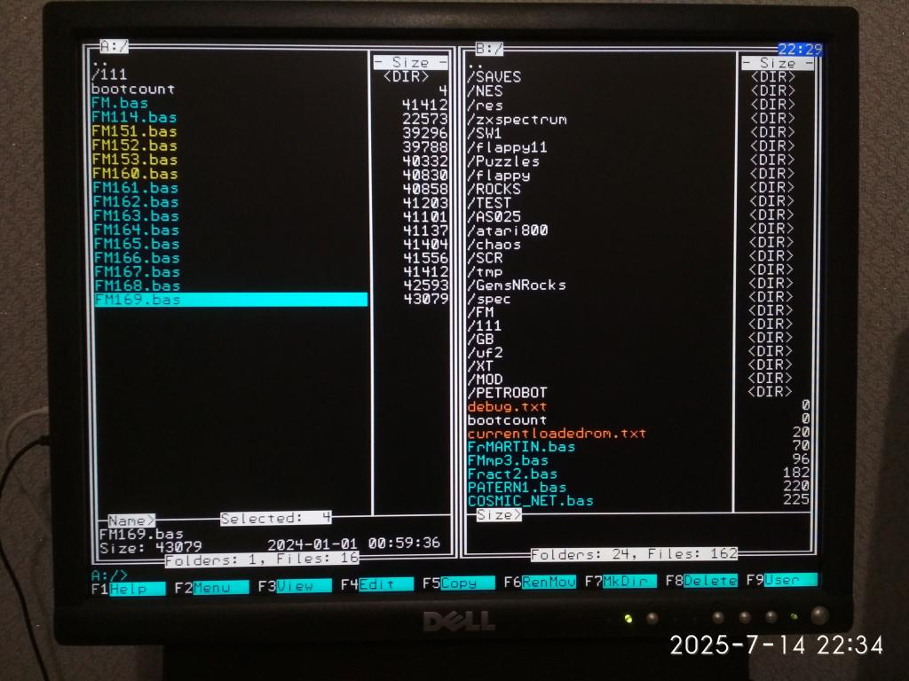 Same conditions as above, viewing pictures and returning to FM works now for me. I tested playlist function for .mp3 and it works. I can skip to the next song by pressing pause but how can I stop playing at all as it loops from the last track to the first. Is there a key? I can stop it by selecting a non playable file.. It would be very nice, if the playlist function would work for pictures in a diashow as well.. I have attached an USB keyboard and HDMI Monitor and use simultaneously the serial console and its keyboard. USB keyboard works fine, serial not in FM. But if I choose a file and edit it with F4, within the editor there are no errors at all. I haven't seen this behavior before..don't know |