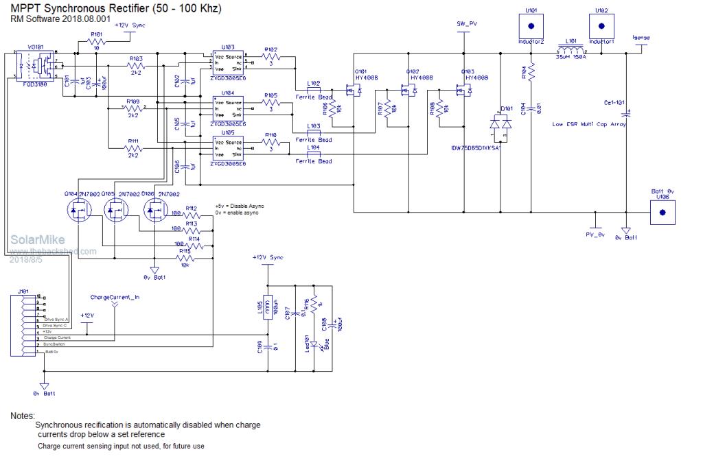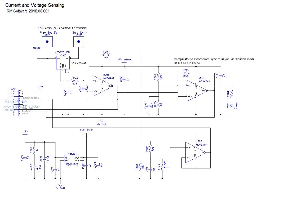 I agree Tony it might be a monster, but hopefully manageable, in that some components can be left off if not required. Changes to the sensing board: Addition of anti-aliasing low pass filters for battery and PV voltage measurement and temperature control sensing. Hopefully this part is now sorted, driver next, unfortunately it will have an associated CPU but this could be any type as most of schematic will be analog - logic components, CPU functionality will be limited to mppt voltage settings etc, display and alarms, the basic controller will be able to be tested/setup with no CPU installed; that's the intention anyway. ![]() Cheers Mike |