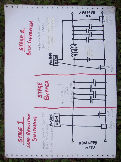 The MPPT is a 2 stage type. Each stage carries out a distinct and separate function. In both cases amps are monitored and the Pulse Width adjusted to peak the amps. This tracking and adjustment to peak with an ever changing wind, makes this MPPT suitable for any machine (see Note above) and does not require look-up tables that is individualised and a substitute for a missing first stage. Stage 1. The function of this stage is to cause the shaft power to track the wind power instead of the velocity as it does on our setups now. Whilst achieved by the variable pitch prop which adjusts the pitch to a coarser angle (lower TSR) to avoid stall, and so by prop gearing, match the fixed wind power to the fixed gen load. This method allows the fixed wind power through a fixed pitch prop to match the varied load of the generator. With the wind power matched to our gen(load) power at peak rpm. Most lesser rpm has the generator load power more than the corresponding wind power because of the fixed prop with it's fixed TSR. By reducing generator load the mismatch is eliminated. The gen loading at any rpm is reduced by repeated disconnecting the battery for microseconds. This tracked point sees a peak in Amps and Volts out of the generator. Now the Volts and Amps follow the wind power instead of the wind velocity. Stage 2. Now that we have a generator with Volts and Amps that track the wind power, it must be applied to a load. If a resistive load like a heating element, nothing further need be done. For battery charging, after cut-in is achieved, the excess volts go to heating the stator coils and rectifier and are lost to our battery. We can recover this lost potential and convert it to even more current. Here I've used the the simplest form of Buck Converter(because I'm dumb with limited knowledge) to do this task. I imagine Solar MPPT are designed to a more sophisticated standard by the professionals. Whilst they do the same task of this second stage, Solar MPPT do not have to contend with the much higher range of voltages delivered by a wind generator. The result of buck conversion is that the Amps through the freewheeling Diode sub-circuit and the Allegro Current Sensor are higher than those of Stage 1. The monitoring of these amps by the PicAXE allow it to adjust the pulse width to a peak and ever changing value. An even better understanding of Stage 2 can be had from this ZIP. 2008-06-28_145343_MPPT_Technology_.zip Stage Buffer. Due to the very important Independence of switching in each stage, the OFF state of one cannot be allowed to interfere with the ON state of the other. To ensure this is so a large storage capacity is inserted between the stages to buffer all conflicting switch states. Code. The code for both PicAXE are almost identical but opposites. I've chosen 20,000Hz as the Pulse frequency thinking to make components more readily accessible. Though I fancy 1,000Hz for Stage 2 as it is the desulphation frequency. A PWM code would need to be specially written as that Fq is well outside the PicAXE's PWM function. Perhaps component selection will ultimately dictate what will be finally used. Code: 2008-06-28_145454_MPPT_Stages1_&_2_v1-0.zip So there is Wind MPPT as I see it coming together for me. I feel I have the concept right. Now all I have to do is select the right components. Send search party if nothing more is heard as I disappear into the mire. If it ever gets finished, who knows. If I can take some of the complexity and techno jargon out of the word MPPT some measure of success is achieved. Gill EDIT: Code has been updated to v1.1 to overcome some errors. Sorry bout dat. 2008-06-30_133712_MPPT_Stages_1&2_v1-1.zip and a further update for those wanting supa fast tracking of supa fast wind gusts: 2008-07-04_223505_MPPT_Stages_1&2_v1-2.zip was working fine... til the smoke got out. Cheers Gill _Cairns, FNQ |