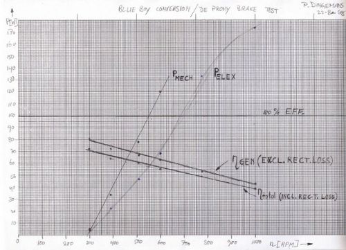 Hi Peter, Thank you for your comments. I hope you especially will benefit with your concurrent conversion project. The efficiency curves you've posted there are interesting to look at beside mine. At every connection or voltage there is clearly a peak soon after cut-in, and a rapid decline. The slow decline in efficiency of your 500W conversion starting at 80% testifies to the benefit of the re-wind. I don't worry much about the thrust load... Have you ever worked out the gyroscopic loads? I want the big bearing on the front for that! As for the air hose, that wasn't my idea. If it was my Colchester, I'd be cleaning it with a toothbrush. Actually, years ago, it was my job to clean it from time to time. Time, new shop personnel, and changing responsibilities at the company carry me away from those "good old days". Oztules, I know what happened when you tried resistance loads instead of batteries... Steven T. Fahey |