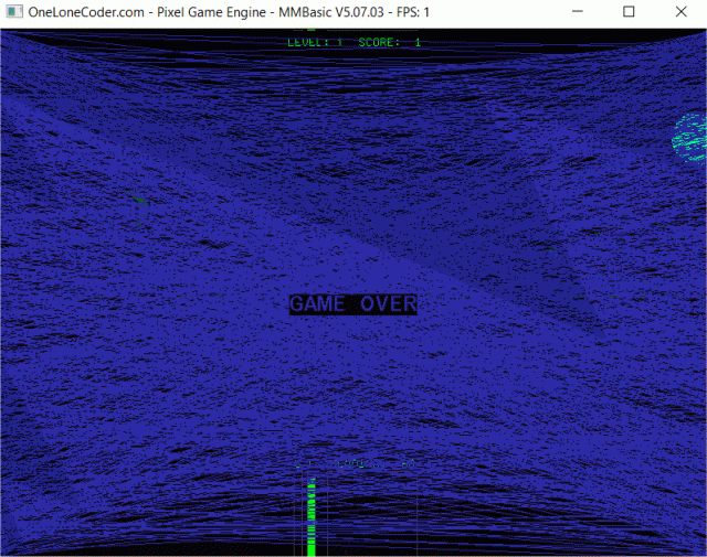 I can see shots incoming and outgoing, but no cubes or pyramids (or on re-looking, tiny cubes and pyramids which I am not able to align with to shoot--if I'm supposed to shoot them). I occasionally see a shooting moving enemy, and succeeded at hitting on. I did see what appeared to be an aircraft or starship, and destroyed it. Perhaps I'll last longer if I don't shot without seeing what I'm shooting at. Sometimes I see blue triangles which grow larger as they approach. If I do nothing, the column marked "S" diminished and after about 45 seconds, I get "GAME OVER". PicoMite, Armmite F4, SensorKits, MMBasic Hardware, Games, etc. on FOTS |