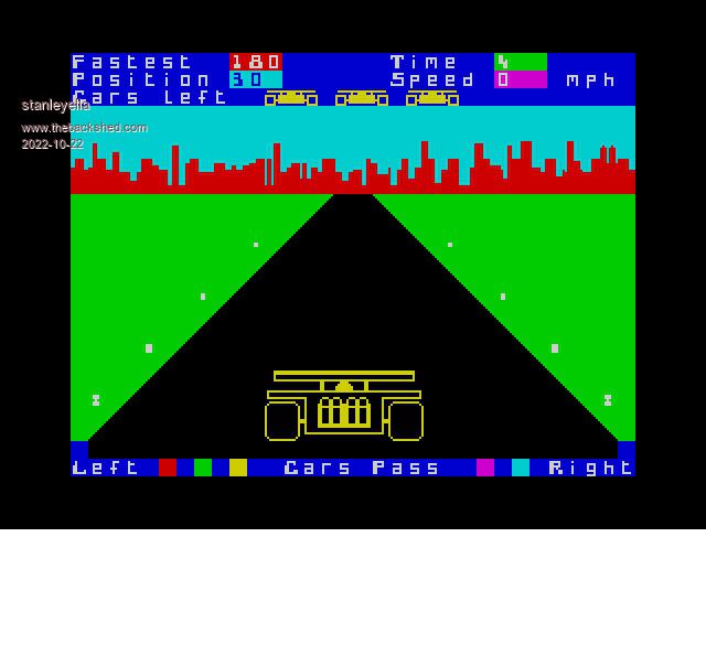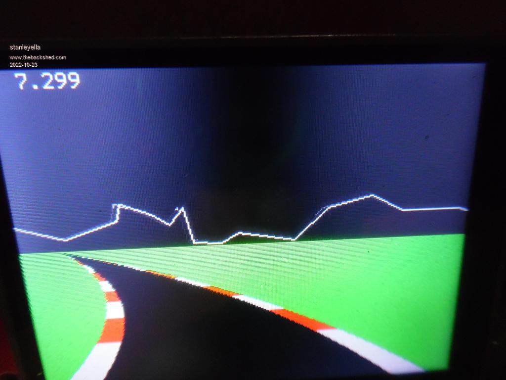 What fun! Here's a modification to include a track. At the very end is a data block that encodes the track. You can change it for any course you might like. I'm not sure if I have the sky movement correct. I don't have an SD card connected, so I can't load the sky graphic to test. autosave Dim Col%(15),Xofs%(2,160) Restore colors:For f%=1 To 15:Read Col%(f%):Next f% 'SH% and SW% Displayresolution 'SH%=240:SW%=320 - use MM.HRES and MM.VRES instead dist%=0:Speed%=20 Option Break 4: On Key 3, on_break MODE 2 FRAMEBUFFER create FRAMEBUFFER WRITE F read_sprites 'Precalc the Curve For f%=0 To 159 Xofs%(1,159-f%) = ((160*Exp(f%/50))/20)-8 Xofs%(2,159-f%) = -Xofs%(1,159-f%) Next 'Precalc the Bordercolors Dim Bcol%(6,120) For dst%=1 To 6:For f%=0 To 120 bcol%(dst%,f%)=col%(7-3*((Sin((((120-f%)/40)^3)+dst%))>0)) Next :Next :dst%=1 ' CLS COL%(1): Load image "sky.bmp" HW%=MM.HRES/2:HH%=MM.VRES/2 '-------endless loop ----------------------- ' n is degree of bend n%=0 ' current curvature - start off straight t%=Timer:fcnt=0 Do Read turn%,dur% If dur% < 0 Then t%=(Timer-t%)/1000:Text 1,1,Str$(fcnt/t%,3,3) ' show framerate t%=Timer:fcnt=0 Restore TrackData Continue Do ' restart the track EndIf If n% < turn% Then ' adjust curvature towards left For i = n% to turn% Step Speed%/dur%*100 DrawTrack i:do_car:Mov_sky -Sgn(i):FRAMEBUFFER COPY F,N:inc fcnt Next n%=turn% ElseIf n% > turn% Then ' more to right For i = n% to turn% Step -Speed%/dur%*100 DrawTrack i:do_car:Mov_sky -Sgn(i):FRAMEBUFFER COPY F,N:inc fcnt Next n%=turn% Else ' continue along path For i = 1 to dur% 'Step -Speed%/dur% DrawTrack n%:do_car:Mov_sky -Sgn(n%):FRAMEBUFFER COPY F,N:inc fcnt Next EndIf Loop '------------------------------ 'b1x% left x position of the left Border 'b2x% right x position of the left Border and left x position of the street 'b3x% right x position of the street and left x position of the right Border 'b4x% right x position of the right Border 'BB% Border broad 'bc% Border Color (red or white) calculated over Sinus Function 'HH% Half Screen y-Res HW% Half Screen x-Res 'xofs%() Pre calculated Curve over Exponetial function 'ofsx% how much has the Curve to be bended Sub DrawTrack curv Box 0,hh%+2,MM.HRES,hh%-2,,COL%(2),COL%(2) For F%=2 To HH% bc%=bcol%(dst%,f%):ofs%=xofs%(2,f%)*curv/100:y%=hh%+f%:BB%=f%/4 b1X%=HW%-F%-bb%+ofs%:b2x%=HW%-F%+ofs% b3x%=HW%-F%+ofs%+2*f%:b4x%=b1x%+(2*bb%+2*f%) Line b1x%,y%,b4x%,y%,,bcol%(dst%,f%) Line b2x%,y%,b3x%,y%,,0 Next Inc dst%:If dst%>6 Then dst%=1 End Sub '--- Moves the Sky while driving a curve Sub Mov_sky dir% Local mv1%=1,mv2%=2 If dir%=0 then Exit Sub ' driving straight so sky doesn't change ' need to adjust time to draw nothing EndIf If dir%>0 Then Sprite read #31,0,28,mv2%,22 Sprite Mv2%,28,0,28,320-mv2%,22 Sprite write #31,320-mv2%,28 Sprite read #31,0,50,mv2%,22 Sprite Mv1%,50,0,50,320-mv1%,22 Sprite write #31,320-mv1%,50 Sprite read #30,0,102,mv2%,10 Sprite Mv2%,102,0,102,320-mv2%,10 Sprite write #30,320-mv2%,102 Else Sprite read #31,320-mv2%,28,mv2%,22 Sprite 0,28,mv2%,28,320-mv2%,22 Sprite write #31,0,28 Sprite read #31,320-mv2%,50,mv2%,22 Sprite 0,50,mv1%,50,320-mv1%,22 Sprite write #31,0-mv1%,50 Sprite read #30,320-mv2%,102,mv2%,10 Sprite 0,102,mv2%,102,320-mv2%,10 Sprite write #30,0,102 EndIf 'Sprite CLOSE 31 End Sub Sub do_car If dist% Mod 2 Then Sprite write #1,132,200 Sprite write #1,160,200,1 Else Sprite write #2,132,200,1 Sprite write #2,160,200 EndIf End Sub Sub read_Sprites Local nr%,p%,n%,byt$,m$ '--- Read/Create Sprites Restore car For p%=1 To 31 Read Byt$:Byt$=expand$(Byt$) For n%=1 To Len(Byt$) m$=Mid$(Byt$,n%,1) Pixel n%-1,p%,COL%(Val("&H"+m$)) Next Next Sprite read #1,0,0,28,32 Sprite read #2,28,0,28,32 End Sub Function expand$(pxl$) Local n%,nmb%,tmp$,co$ For n%=1 To Len(pxl$) If Asc(Mid$(pxl$,n%,1))< 71 Then ' asc("G") = 71 tmp$=tmp$+Mid$(pxl$,n%,1) Else ' run length encoded - 1st char is pixel colour+71, 2nd is count-1 co$=Hex$(Asc(Mid$(pxl$,n%,1))-71) Inc n%:nmb%=Val("&H"+Mid$(pxl$,n%,1)):tmp$=tmp$+String$(nmb%+1,co$) EndIf Next expand$=tmp$ End Function Sub on_break Sprite CLOSE all: FRAMEBUFFER CLOSE MODE 1: Option Break 3 End End Sub colors: '--Colorscheme accordung to matherp Data RGB(BLUE),RGB(GREEN),RGB(CYAN),RGB(RED) Data RGB(MAGENTA),RGB(YELLOW),RGB(WHITE) Data RGB(MYRTLE),RGB(COBALT),RGB(MIDGREEN),RGB(CERULEAN) Data RGB(RUST),RGB(FUCHSIA),RGB(BROWN),RGB(LILAC) car: Data "GFGFGFG7","GFGFGFG7","GFG9P3GFG9","GFG8917719GFG8","G8N3GA91J319GAN3G8" Data "G7788087G5EECF11M311FCEEG5780887G7" Data "G678FF00800FDCFC48F11M311F84CFCDFG77G6" Data "G67G5DD4U2C4B107M3701B4CU24DDG2FF07G6","G67G4U6C4B107M3701B4CU6G47G6" Data "G67G3U8AB1U71BAU8G37G6","G67G2U24CU4AAU9AAU4C4U2G27G6" Data "G6700U3KFKBU3007G6","00N5U54OFO94U5N500","07788G6EEKFKBEEG688770" Data "078G9E4OB44OB4EGA70","0700FF0V3001KAEK3EKA1GA70" Data "07GA14HAK3HA4100V30FF0070","07GA14019R255911K311955R291041GA70" Data "07GA5119R2L2911K3119L2R29115G9770","07GA551R3L2911K3119L2R3155G9770" Data "07GAL99V79L9G9770","077G9L99V79L9GA70","077G9551R3L29B8R38B9L2R3155G9770" Data "077G9519R3L29B891198B9L2R3915G9770" Data "07GA919BB9H259B891198B95H29BB919GA70","07GA791BBH49B8R38B9H4BB197GA70" Data "07GA70819H49B8R38B9H491807GA70","07GA7G2H489O9H5007GA70" Data "078G887G4H2GBH2G478G8870","0778G6877GFGB778G68770","00NAGFGDNA00" TrackData: ' encoded track ' first value is amount of curve, negative = right, 100 is just off screen ' second value is duration of segment, negative = end of track, restart Data 0,200 ' straight for a bit Data 50,500 ' start turn to the left Data 50, 50 ' hold turn to the left Data 0,400 ' return to straight Data 0, 30 ' straight for a bit Data -100,1000 ' turn to right Data -200,500 ' turn even sharper to right Data -100,300 ' reduce right turn Data -10,500 ' reduce turn even more Data -10, 25 ' hold gentle right turn Data 200,250 ' turn hard left! Data 0,200 ' return to straight Data 0, 50 ' straight for a bit Data 100,150 ' turn left - chicane Data 0,100 ' return to straight Data -100,100 ' tu