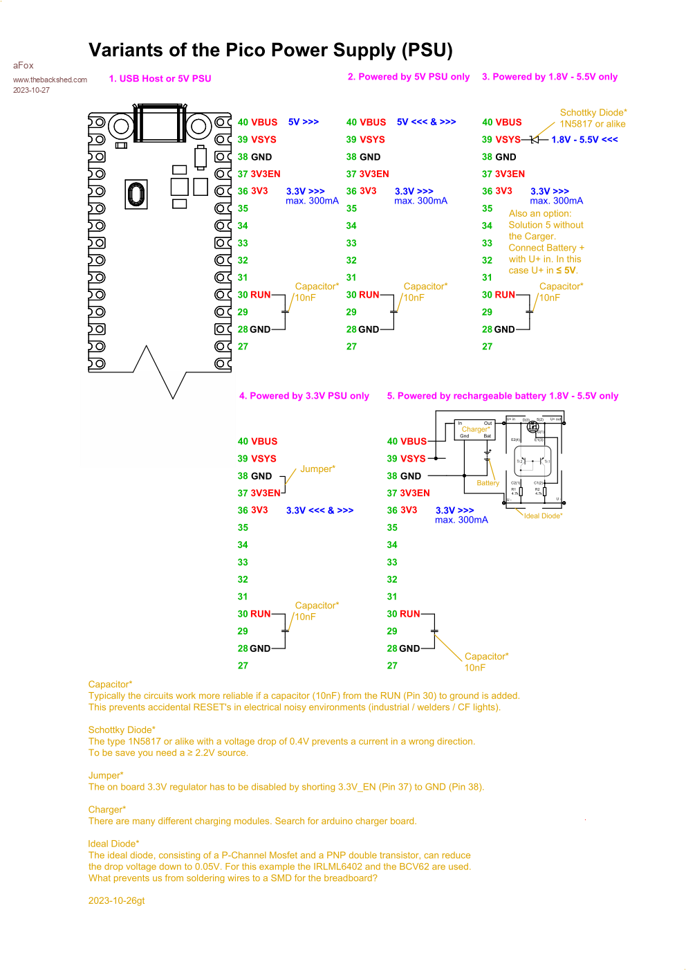 Cheat Sheet Update Many thanks for your help. I have changed the Mosfet part because I found a detailed Ideal Diode description. For more details see: https://praktische-elektronik.dr-k.de/Praktikum/Analog/DiodenTransistoren/Le-Ideale-Diode.html Sorry only in German, use Google Translate. I have not problem to get the suggested parts here in Germany. What is in your country? Comparsion Types: P-channel Mosfet IRLML6402? PNP double transistor BCV62? ![]() ![]() Pico Power Supply Cheat Sheet 2023-10-26.zip Any suggestions are welcome! Gregor Edited 2023-10-27 10:21 by aFox |