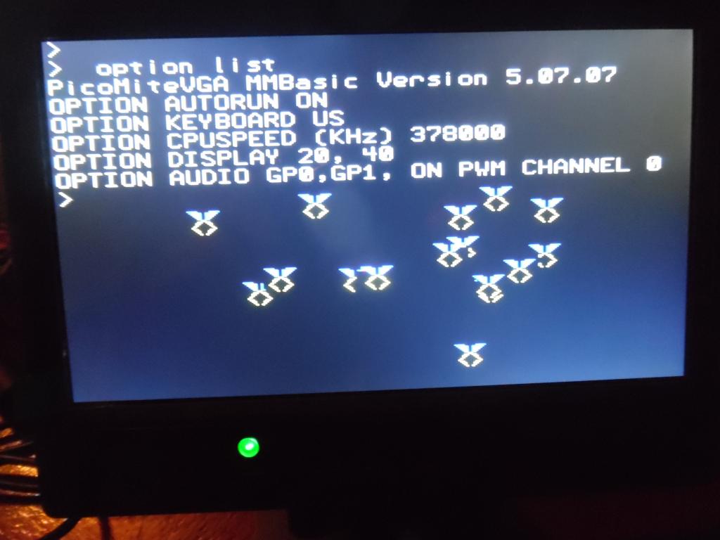I have been using the display in the first post, and it is amazingly sharp and bright on the PicoMiteVGA. Good picture, good colors, viewing angle is great. I power it from one USB port of the laptop with the included cable. The other USB port is for the PicoMite Third for the mouse (not a touchpad guy). Good investment. I can write code on the kitchen table without the larger 19" screen. Volhout PicomiteVGA PETSCII ROBOTS |