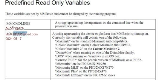 A question by the way I have now adapted the code, so that it runs on MMB4W GameMite and PicomiteVGA without any changes Since MMB4W/MMB4L basically behaves like CMM2, it should also run on CMM2. So they might run on both with the MMB4W routines. My question is, what String does CMM2 and MMB4L return if I use mm.info(device)? Cheers Martin Edited 2024-05-17 18:55 by Martin H. 'no comment |