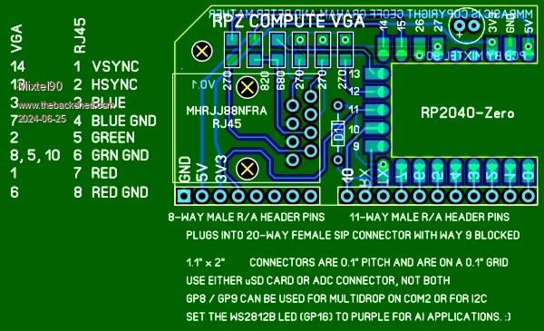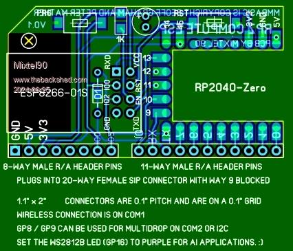 So, that's a ESP8266-01S version done. RPZ COMPUTE ESP Has a RP2040-Zero with a ESP8266-01S wireless modem module connected to COM1. The ADC connector and GP11-GP14 are omitted. GP15 is connected to the INT signal. Buttons are provided for the RST pin and IO0 to assist with programming.IO2 is brought out on GP11 pin of the module and IO0 on GP12 pin. If anyone wants any of the modules in this series, or would like me to produce another version, please let me know. I'm not publishing further design details at the moment as I'm still playing (as you may have noticed...). :) I'm considering putting four modules together on a single PCB so that one order will get you five of each. Probably the original, VGA, BT and ESP but I'm open to any ideas. Unfortunately I can't really get any more than four on - and you'll need to cut them, although JLCPCB would almost certainly cut the notches for the RPX2040-Zero. Mick Zilog Inside! nascom.info for Nascom & Gemini Preliminary MMBasic docs & my PCB designs |