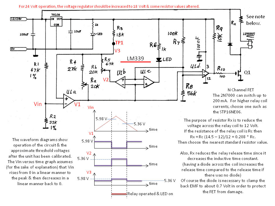 The control module will work from 15V to 65V, so would not be suitable for a 12V system without mods. I took the liberty of designing with a DC-DC converter with a simple pre regulator. There is a simple picaxe micro, with voltage sensing, driving a mosfet, that drives the relay. There is some hysterysis and timing involved.