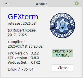 looks like you are right. but it appears that 64-bit versions of raspbian can also run 32-bit applications, so the (32-bit) binary you have created should cover both ![]() from the right-click menu in GFXterm, if you select 'about' you should see a small window pop up containing some build information, similar to this: ![]() what information does yours contain? btw, from the above window you can click on "CREATE PDF MANUAL" to cause a copy of the user manual to be saved to the desktop. cheers, rob :-) Edited 2025-12-31 21:30 by robert.rozee |