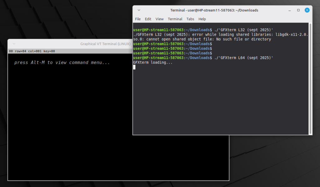 so if you try to run it from a terminal window (the equivalent of a command prompt in winXP), there are no error messages reported on that terminal window? i just tried both L32 and L64 versions of the GFXterm binary from GitHub on a clean install of Linux Mint 22.3 XFCE (INTEL processor). this is the results i saw: ![]() note the 32-bit binary produced a similar error message to what Jim was seeing, while the 64-bit binary ran fine. i was then able to add some 32-bit packages to allow the 32-bit binary to run. for INTEL platforms, the required incantation was: sudo apt install build-essential libc6:i386 libstdc++6:i386 libgtk2.0-0:i386 libatk1.0-0:i386 (from: https://forums.linuxmint.com/viewtopic.php?t=324997) this all suggests to me that we will need both 32-bit and 64-bit versions of GFXterm for ARMHF in order to avoid 64-bit Raspbian users needing to jump through hoops installing additional libraries. i also suspect that Jim may have ended up with a 32-bit version of Lazarus/FPC. likely 64-bit Raspbian out-of-the-box contains enough smarts to run a 32-bit non-GUI application, but not enough to run a GUI (in particular GTK2) application; the Lazarus IDE is just a GUI GTK2 application, while the FPC compiler (used by lazbuild) is a non-GUI application. hopefully the above makes some sense - it is 4am here and well past my bedtime! cheers, rob :-) Edited 2026-01-02 01:16 by robert.rozee |