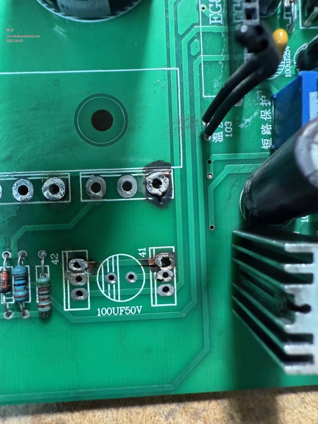 And I added more damage by tearing the top side copper foil. Luckily, I can beef up the connection at the bottom side. To avoid further copper foil damage, I cut two adjacent legs of the mosfet (my small cutter can reach only two) so that I can easly desolder and pull the remaining leg. I will be replacing all 24 mosfets anyway.