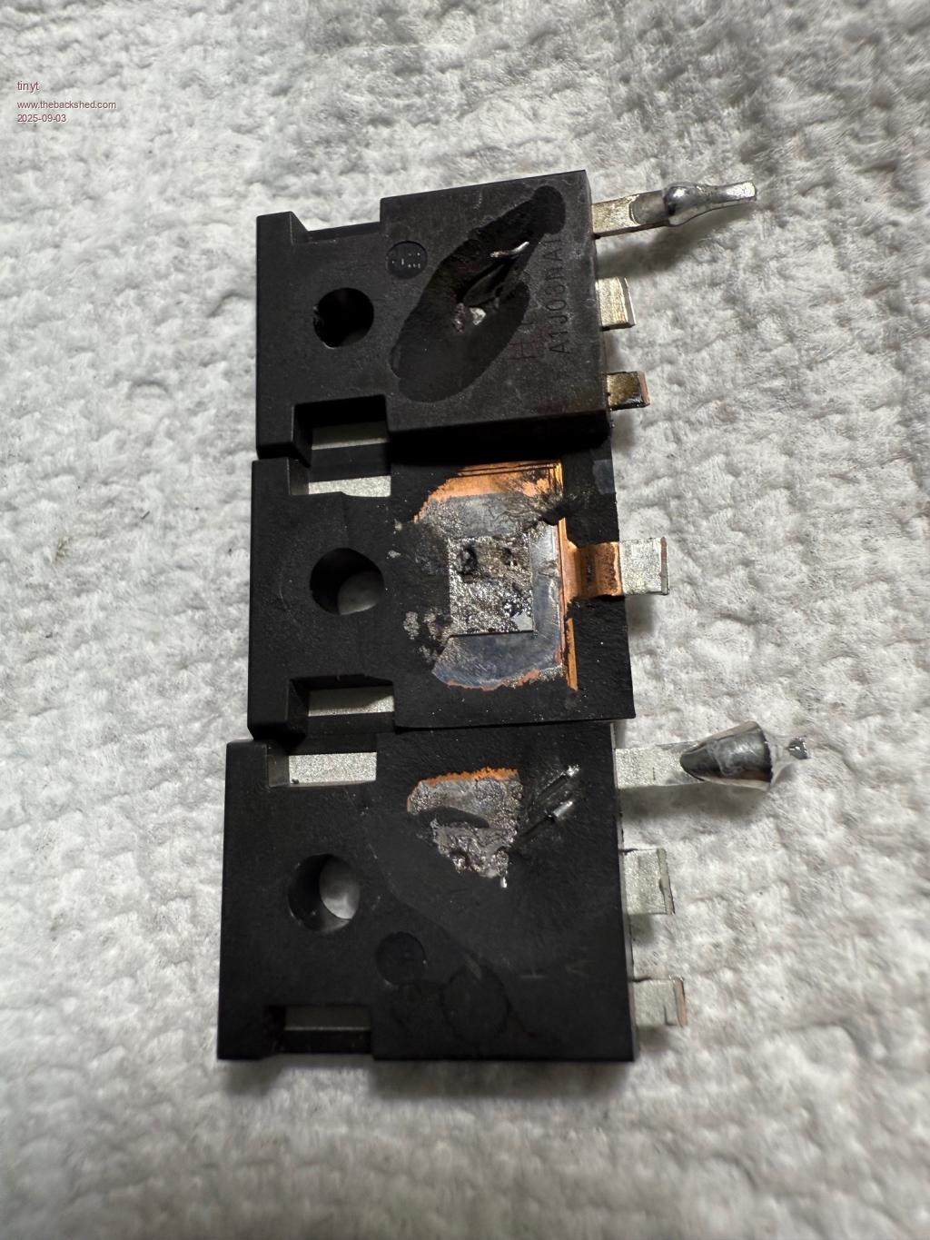 Here is close up of three blown mosfets. The top mosfet shows one of the source terminal bond wire sticking out which measures roughly .013" (.33mm) dia. with a caliper. The bottom mosfet seems to show that there are two bond wires for the source terminal. And apparently their explosion caused the body to crack.