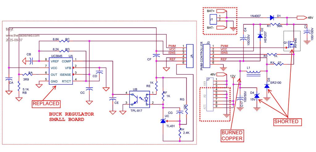 After removing all 24 mosfets and four pairs of totem-pole drivers, I tested to see if the 48V to 12V buck converter circuit is working.