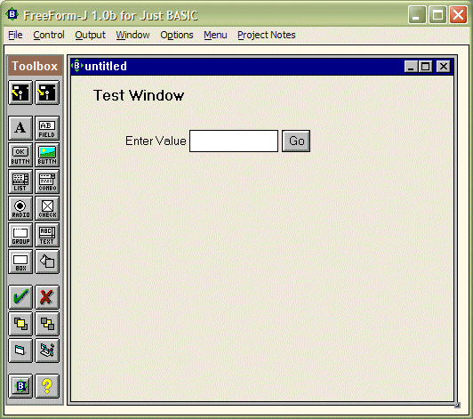FreeForm will generate the code to copy/paste into your Just BASIC program. This code will create the form above. nomainwin WindowWidth = 440 WindowHeight = 395 UpperLeftX=int((DisplayWidth-WindowWidth)/2) UpperLeftY=int((DisplayHeight-WindowHeight)/2) statictext #main.statictext1, "Test Window", 26, 16, 144, 20 textbox #main.textbox2, 134, 61, 100, 25 button #main.button3, "Go", [button3Click], UL, 238, 61, 32, 25 statictext #main.statictext4, "Enter Value", 62, 66, 144, 20 open "untitled" for window as #main print #main, "trapclose [quit.main]" print #main, "font ms_sans_serif 10" print #main.statictext1, "!font MS_Sans_Serif 12 bold" The more I play with the software the more I like it. I've writte a test program that receives PicLog data and sends it over the internet. FreeForm-j can be downloaded from here., Just BASIC is available from here. Glenn The best time to plant a tree was twenty years ago, the second best time is right now. JAQ |