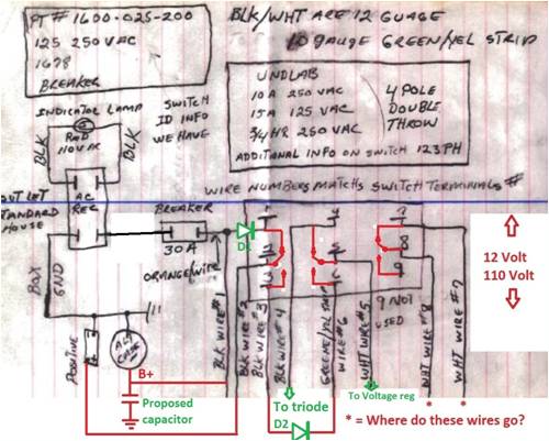 Len, Can you confirm your drawing will if used? Not cause any damage to the system, or interfere with how the switch works. The diodes won't cause any damage, but you need to think about the point I raised re D1 above. 12 Volts in one mode and 110 in the other? I don't understand the diode in wire 3 and 6 where they are spliced together? Diode D2 is to prevent damage to the voltage regulator if you accidentally reverse the battery.