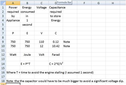 I want the cap to store a small charge to stop from stalling my old engine when connected to a low battery or a heavy 100 Volt load as it stalls the engine sometimes.