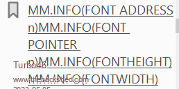 As part of my efforts to make the syntax lists in MMEdit more accurate, I have been scraping the source code of MMB4W (latest on github is Dec 22) The attached zip contains the output of my work. It might be of help As an example mm.info gives: fun MM.Info( SOUND SAMPLE PLAYING FONT POINTER FONT ADDRESS CPUSPEED MAX PAGES CPUSPEED PAGE ADDRESS FRAMEBUFFER DIRECTORY ENVVAR EXISTS FILE EXISTS DIR EXISTS OPTION ANGLE Y_AXIS AUTORUN EXPLICIT DEFAULT BASE BREAK CONSOLE SEARCH PATH DEFAULT PATH PROGRAM TRACK AUTORUN DEVICE DEFAULT PATH VERSION VARCNT CURRENT PATH FONTWIDTH FILESIZE FAST TIME FONTHEIGHT FONTCOUNT WIDTH HEIGHT HPOS VPOS ERRNO ERRMSG FCOLOUR BCOLOUR FRAMEH FRAMEV WRITE PAGE FONT mmb4w_command_list.zip Jim VK7JH MMedit |