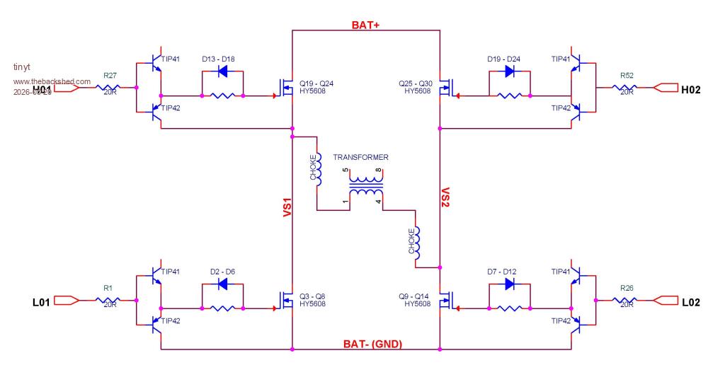 A little more progress, 10K resistors at the 4 TIP42C transistors, checked and everything still seems to work, next I connected a toroid with a 15v primary and a 10ohm 25w resister (all I had) between the VS1 and the one toroid primary no chokes in the primary yet but really should have spent the time to put one in.... then put a 4Uf cap on the secondary no filter and just a volt meter. Tested and got a little over 53vac at the secondary using 1 amp at 13vdc from the PSU, the 10ohm resistor was getting hot, it didn't like the 4uf cap on the secondary, reason would be I had no chokes on the toroid primary, so removed the 4uf cap on the secondary and tested all the way up to 26vdc input and now have 236vac on the output and using .33amp. Close to calling it working.