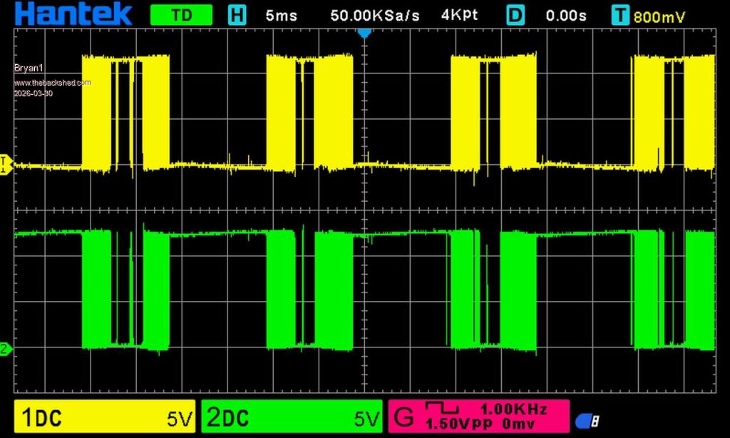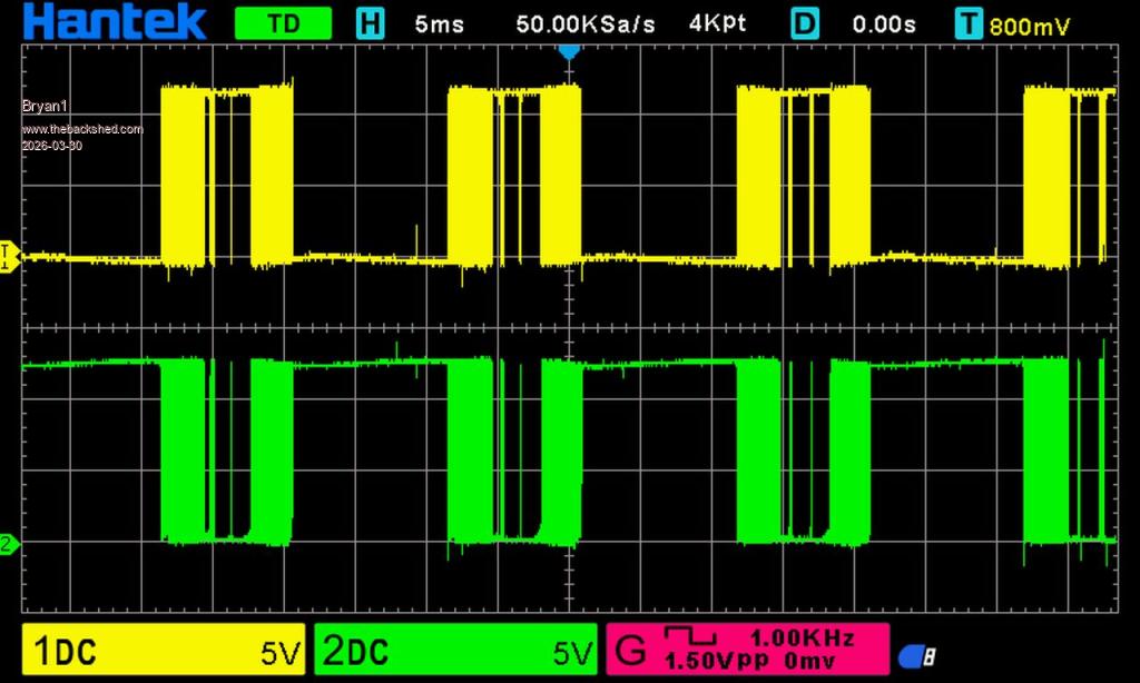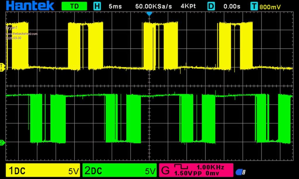 Ok I desoldered the 10 pin connector and clearly saw the H02 pin connection didn't have any solder so now the 10 pin connector sit about 5mm high as I soldered the top pads Now tried again and still voltage to R52 so thought ok the only thing this can be is the ribbon connector Got out my 10 pin ribbon connector for my AVRDude as shown belowH02 L02 ![]() H02 L01 ![]() H01 L01 ![]() L02 L01 ![]() So hopefully these scope pic's are right |