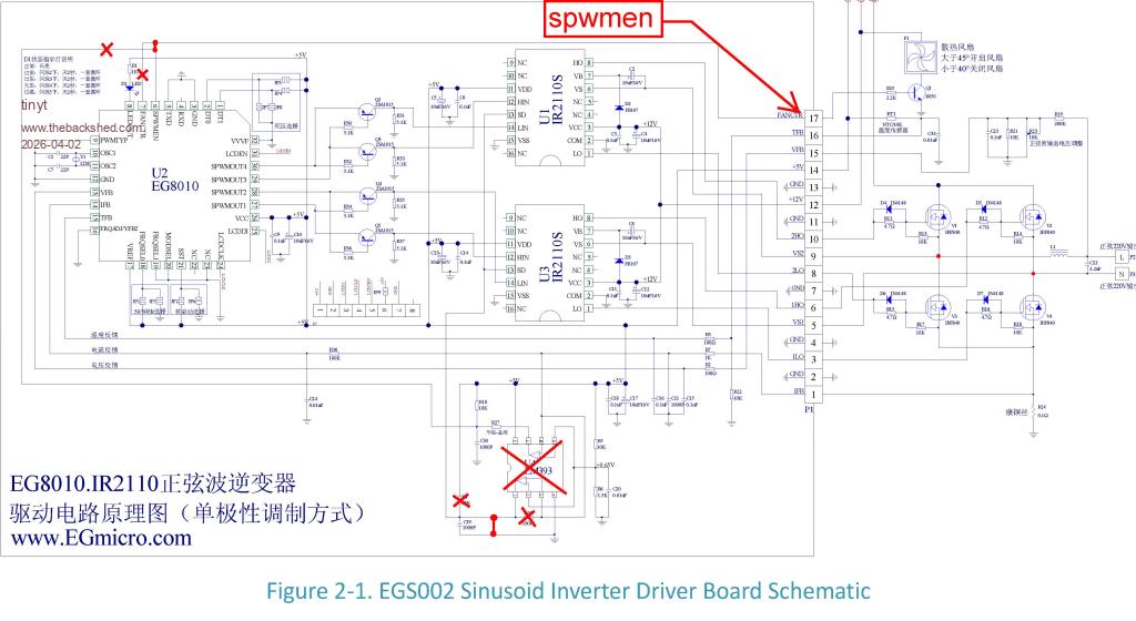 Here is the modification in schematic form. The U4 mod basically disables the SD(shutdown) signal to the IR2110 chips. The trace cut and long jumper changes FANCTR to external SPWM ENABLE (inverter Start/Stop switch), alternate is fixed enable via U4 pin 7 to pin 8 jumper. The C24 jumper disables IFB signal to the EG8010 chip (allows overload abuse). Your choice to incorporate these two mods. ![]() Edited 2026-04-02 13:17 by tinyt |