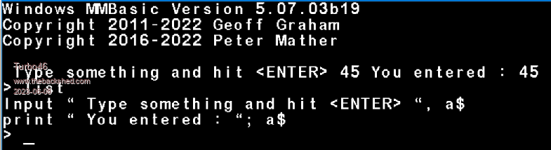 Can someone please confirm that I am not the only one seeing this: The program: Input " Type something and hit <ENTER> ", a$ print " You entered : "; a$ produces this output: ![]() MMB4W does not 'print' a CR/LF after an INPUT statement but it does after a PRINT command. My OPTIONs are exactly the same as TassyJim's above except for the default path. The same thing in MMBasic for DOS is correct I can work around it of course but I would like to know whether it is MMB4W or me doing something stupid. Bill Keep safe. Live long and prosper. |