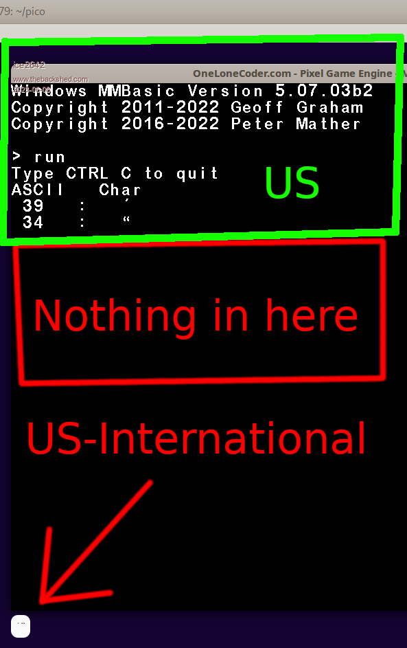 It seems it doesn't even support as per the terminal. The windows version does not. The simplest way for anyone using an international US keyboard is to leave the 2 configurations in the system and switch to the default US when running MMBasic. The funny thing is that connecting through Putty or minicom works without any problem, so it can be assumed that it is not MMBasic, but the terminal used. In this case, the windows version uses a game engine to display the graphics (Pixel game engine) and I think that it is having a problem with the keyboard, the same thing with gfxterm that also had this problem, but I don't know if the same engine was used . MMBasic 5.0707 on PicoMite VGA |