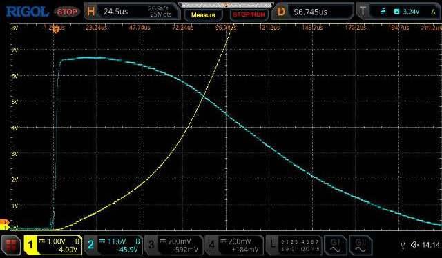oops. With 5 turns the simulator returns very similar numbers to the calculated numbers from your curves. For reference, I built this circuit, using just 1 555 (using storage scope), a voltage regulator and 6 FETS so I could crank up the current and voltage. I have 52,000uF (overkill) and the voltage drops 1.7v after supplying 800A for 50uS. After seeing these numbers, I can better understand how easy it is to kill FET's when you have a fault which essentially shorts the capacitor bank. Greg |