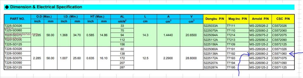 Here is a cross reference I pulled from the Karson's website Different manufacturers unfortunately use different part numbering schemes, however the FM part number seems to follow the same scheme as CSC part number. However it is obviously not a standard sendust core material, because it saturates differently. Let's run a few calculations. Greg |
