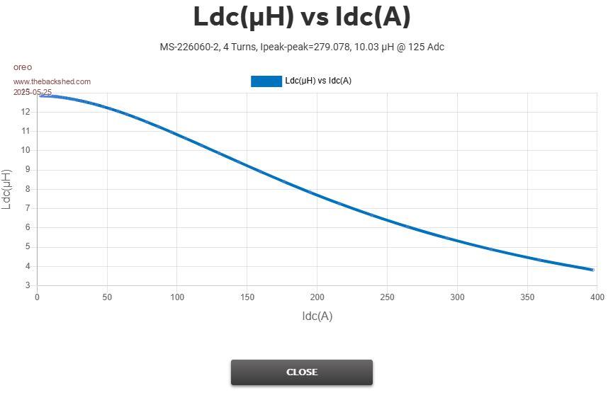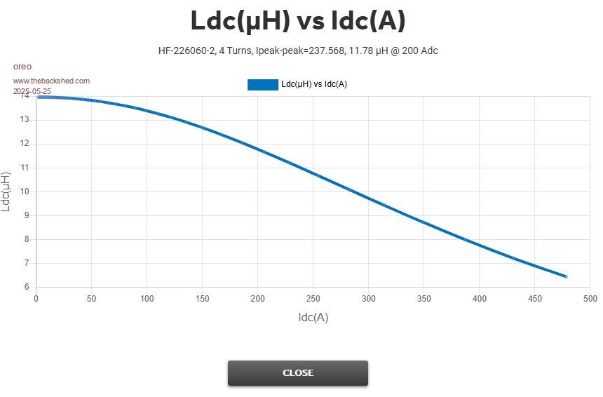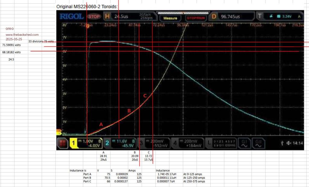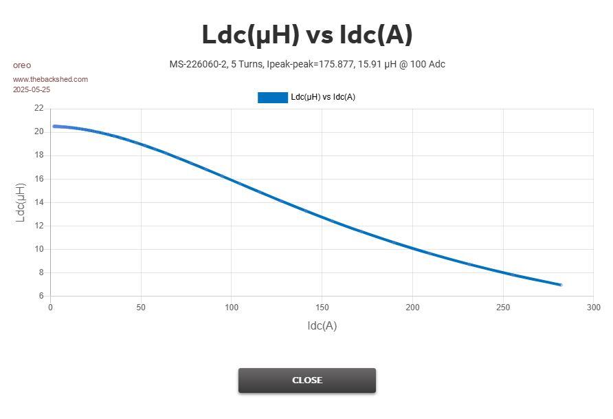I had already calculated the old Blue toroids and obviously got the same results, however these still don't show the real picture, especially as the Voltage sags and throws out the intersect points for accurate calculations, but good for comparing different sets of Chokes. I'm going to make a new Sat tester with max current limiting and stiffer Voltage, testing a choke at working voltage and current does change the results somewhat. BTW the Micrometals Sim above is 4 turns, I have 5 turns in these @ 22.6µH @ 20kHz. Edited 2025-05-25 15:53 by KeepIS NANO:Inverter V 8.2ks - Linux AvrDude GUI script V4.1 |