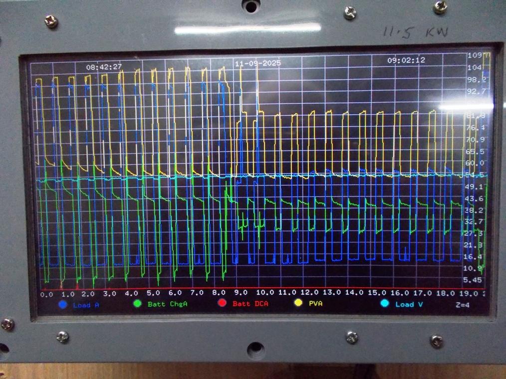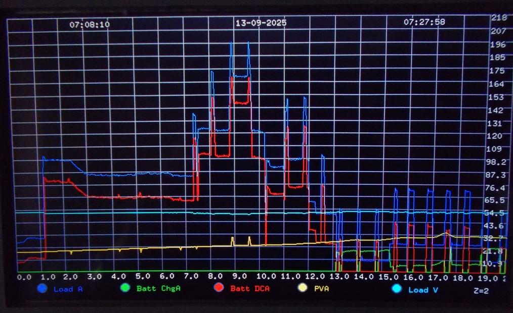 FYI a quick screen photo of the Ceramic Cook Top and other general loads. Blue: Inverter Input current. Green: Battery Charge current. Cyan: Battery Voltage. RED: Battery Discharge current. Yellow: Solar Current. Horz scale in minutes updated every second. Vert scale in Amperes, and in Volts for Cyan trace (Battery Voltage) Because of the single Vertical scale, these reading are slightly low. IE: Battery volts is actually 54V. Below: DC current from Cook-Top cycling from 4.2kW to almost 10kW. Below: Cycling from 640W <-> 5.4kW and then 640W <-> 3kW. Below: The Inverter output Wall power Box, the Tesla kWh meter will accurately calculate Power down to very low power levels (PF does not suddenly go to .58 because of the inability of these colour multi function meters to calculate low Power PF. The "INV AC Direct" switch was for emergency running with just essential devices, I have a feeling this may not be needed, but I have it just in case. These meters were reset recently when the new power box was fitted. _ Edited 2025-09-11 13:09 by KeepIS NANO:Inverter V 8.2ks - Linux AvrDude GUI script V4.1 |