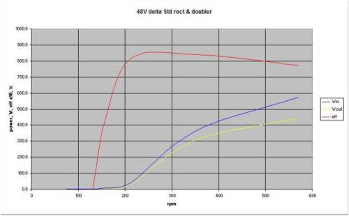 Hi readers, Phill has asked me to publish the first set of graphs. This will give some idea of typical 80SP rewire outputs into 24V & 48V systems with star and delta configurations with and without a capacitor doubler. and what can be achieved with a dual combination as Phill is planning to configure. This is the first of a series of testing. These are not laboratory std results, but all measurements were done on the same day, in the same sequence, with the same instruments and the capacitors used in the doubler were 50uF non polarised type of > 400VAC ratings. The graphs are annotated and should not require explanations. These graphs only test one value of capacitance so far, for a doubler combination only, in parallel with existing rectifiers. 24V Star ![]()