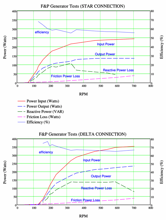 Because a lot of information was provided, I was able to make an analysis of all of the power inputs and outputs. I started with the mechanical power. The force on the lever, times its length gives torque. Torque times rotational speed gives power. For example: At 357 RPM, the Star input force 710 grams x g = 6.96N The arm is 0.846 meter, thus Torque= 7.0 N*0.846 m=5.9 Nm When turning at 357RPM, or 37.4 rev/sec P_in= 5.9 * 37.4 = 220 Watts The same is repeated with the 45 grams to find the power lost to friction and magnetic hysteresis in the iron. P_iron = 14 Watts The output power is pretty easy: 52 V * 2.5 A P_out = 130 Watts Knowing the phase resistance of the stator (in Star) is 6.0 Ohms, then the loss to copper resistance is: 2.5A * 2.5A * 6 Ohm * 1.73 (the square root of 3=1.73) P_copper = 65 Watts So if it takes 220 Watts to turn the generator, presumably those 220 Watts must go somewhere, do something... 14W + 130W + 65W = 209W Where is the missing 11W? A little bit of power may be lost in the rectifier... 1.5V * 2.5A = 4W ...and there's certainly some margin for error in the data, but the shortfall is consistent through all data points. I believe it is lost to "reactive power". Since everyone has been talking about inductance in these F&P's, then it would be a certain amount of reactance that is being counter-acted by the capacitors. Analysing AC circuits with out-of-phase power is a little tricky. I'll try it with a small diagram, but you would be best to look it up on a reference like "All About Circuits", where there is a lot of good explanation. _ \| Using trig, any side of a triangle can be found if you know the other two. Reactive power is 90 degrees to the real power component. A mechanical system, on the other hand, is loaded by the "vector sum" of the components. Usually that's done with the "sum of the square of the sides" approach, and it will work here. The hypotenuse is the mechanical power input (220W) The long side is the sum of the known power demands (209W) The third side is sqrt(220^2 - 209^2) = 69W I have graphed out the reactive power along with the other data for the Star and Delta tests. I don't have the data for the capacitor corrected tests. Ultimately, if there is going to be any "science" to sizing the capacitors, a power analysis like this one can be done to find the amount of reactive power to be counteracted by the capacitors. More tests will help demonstrate that empirically. Steven T. Fahey |