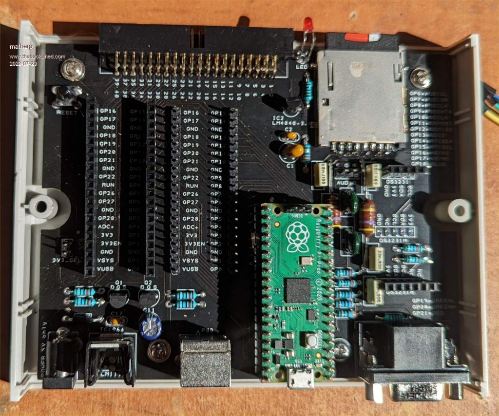 On my board (V1.4 I got from Turbo46) the pinning is (seen from front of connector) Upper row GP1 GP2 GP4 GND GP7 GP9 GP10 GP12 GND GP15 SYS ENA ADC GND GP26 GP22 GP21 GP19 GND GP16 Lower row GP0 GND GP3 GP5 GP6 GP8 GND GP11 GP13 GP14 BUS GND 3V3 GP28 GP27 RUN GND GP20 GP18 GP17 Indeed, the left half is pin number identical to the pico, but the right side seems in inverse order. Maybe that is becuase the pin counting on the pico goes round (40 is next to 1) where as connectors count in rows (1 is next to 2/3, and 40 next to 39/38) I hope this helps. I will try to make a sticker for my unit for ease of connecting. Up to now I had a bare board and I connected to the 2 pico shadow footprints that had silkscreen adjacent the pins. Now I finally came to putting it into a housing, and then ran into this problem. Which is not a problem now I know... Volhout Edited 2022-06-04 22:23 by Volhout PicomiteVGA PETSCII ROBOTS |