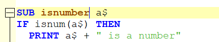 sub isnumb a$ ? a$ end sub doesn't turn isnumb brown but: sub isnumber a$ ? a$ end sub does The same with functions, it seems to me that the name needs to be eight characters long more or less doesn't do it. Bill What happens with sub isnumb(a$) ? a$ end sub John |