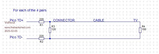 I thought they were differential 100R inputs centred at 2V5? I didn't see anything about them being 50R pullups... Mind you, I couldn't find much technical info on HDMI at all! EDIT: Ah, I think I've found it now. Each signal line has a 50R pullup to 3V3, so each differential pair *appears* as a 100R loop. Ideally this is driven by open-collector/drain outputs from the transmitter. This makes life even more interesting. Minimum voltage swing is 150mV and maximum 800mV across that 50R, I assume, so a minimum current of 3mA and a maximum of 16mA. 220R from the Pico should give about 12-13mA, and 270R about 9mA, I think. That's well within spec. Panic over. :) . Edited 2025-02-05 21:57 by Mixtel90 Mick Zilog Inside! nascom.info for Nascom & Gemini Preliminary MMBasic docs & my PCB designs |