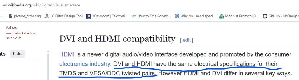 an interesting discussion just a note of warning - while we are using HDMI sockets at each end and HDMI cabling in between, the signalling standards are 100% DVI. we should be ignoring what the HDMI specifications say, and following just the DVI specifications.almost certainly, once a monitor realizes that the video signal coming in is DVI it will adapt the input circuitry to specifically suit the DVI specifications. cheers, rob :-) Edited 2025-02-05 22:15 by robert.rozee |