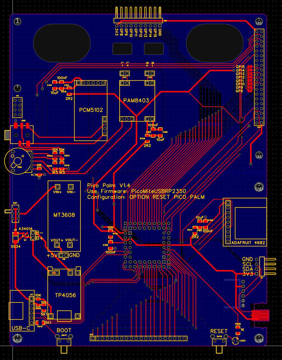 There is an external port with the system i2c allowing you to connect any i2c device, e,g, a Wii Classic. There are also 8 pins (GP8-GP15) assigned to DB8-DB15 on the display. The user can choose to run the display in 8-bit mode (RGB888) slowest but still fast, 12-bit mode (RGB888) mid-speed, or 16-bit mode (RGB565) blazingly fast. By default the Palm Pico set up will assume 12 bit mode leaving GP12-GP15 unallocated. There are zero ohm resistors in the path to the display on the board which can be omitted in the BOM or removed later depending on the user's preference. DB8-DB15 are connected to a header at the top of the board. Edited 2025-10-05 21:45 by matherp |