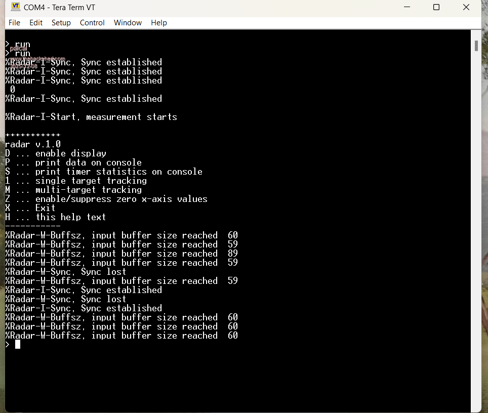 sync lost means that the expected header chars are not received and the app waits for them to come by again. Seems like there are characters lost from the serial line. The serial line itself seems to be setup properly and the senor deliveres data, otherwise you would not get sync lost/sync established messages. If the range-sensitivity is too low, you can use a different scaling factor for calibration. I've set it up for 6 meters for full display, but it seems that the distance readout from the sensor is not very accurate as I measured 3 meters in y-axis distance as being about 1/4 of the display distance only. Didn't dig deeper as I think this can be calibrated out. The lost chars may be because of too low cpu speed or too much time consumed for other code like display update. I've run that on a pico2 RP2450 with 300 Mhz and didn't lose chars except when switching from single to multi-target mode. Could be that the display thakes too much time for drawing the lines/ball. Had a SPI display with standard driver. so nothing really fast.... If I find some time theses days I can try to run that on a pico 1 with low cpu speed and see what the behavior is. Edit: scaling factors are calculated in lines 103/104, the divisor is the maximum length in mm. Gerald Edited 2025-12-08 18:53 by ville56 73 de OE1HGA, Gerald |