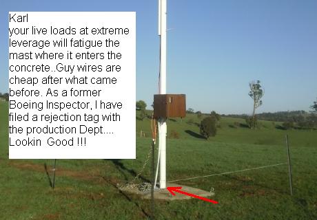 Nope, no guy wires whatsoever and shes pretty solid to boot. Had to be cow proof and short of fencing off 1/2 an acre for the guy ropes this was the only way. Cost is similar but we are a couple of metres shorter than a similarly priced guyed tower. The 3m3 of concrete was almost $500 and the pole (which is crap BTW) is a total of 6.75m tall $840 made of 5" Bore casing 5.65m bottom section and top section about 3.5m with an overlap of ~900mm plus the mount ontop for the turbine to sit in. Now for the next trip, safety system testing, will give the batts and mill a little belting, turn off the GTI, test dump 1 followed by pulling the fuse on the dump 1 to test dump 2, i'm thinking at 800W (have max 1600W in 400W increments) load for dump 2 (normaly both dumps will work together) should give it enough load (given isolated from the batts) to slow her down lots or grind her to a halt. Luck favours the well prepared |