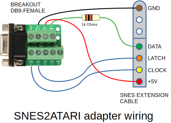 Hi Martin, I've not had my coffee this morning and thus may have my eyes in the wrong way round, but that diagram looks like complete twaddle. I suggest looking at the schematic for the PicoGAME VGA since that is what you are connecting to: https://github.com/thwill1000/pico-game-vga/blob/main/hardware/v2.0/Circuit.pdf On the DB9: Pin 2 = Data Pin 3 = Latch Pin 4 = Clock Pin 6 = +3v3 Pin 8 = GND EDIT: From your link: The SNES2Atari is an adapter that allows you to connect an SNES controller to the Atari 7800 console, Atari 2600 console, the Atari 8-bit computer line, and likely many other platforms that have a DB9 joystick port and can use Atari joysticks. Games must be specifically coded to use the SNES controller. I think that the underlined sentence means that they just "made sh*t up" whereas the port on the PicoGAME VGA conforms to that used by "standard clone" controllers. EDIT 2: Some correct third-party documentation: https://www.nesdev.org/wiki/Controller_port_pinout Best wishes, Tom Edited 2023-11-29 20:18 by thwill MMBasic for Linux, Game*Mite, CMM2 Welcome Tape, Creaky old text adventures |
