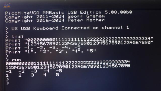 i've been using micromites for what must be 10 years now, and i've always seen TAB characters expand out to multiples of 8. to prove it to myself, i just ran a test: Micromite MKII MMBasic Ver 5.05.03 Copyright 2011-2020 Geoff Graham > list Print "0000000001111111111222222222233333333334" Print "1234567890123456789012345678901234567890" A=-1: B=-2: C=-3: D=-4: E=-5 Print A,B,C,D,E > > RUN 0000000001111111111222222222233333333334 1234567890123456789012345678901234567890 -1 -2 -3 -4 -5 > > and capturing the raw output: user@HP-stream11-392758:~$ ./Desktop/GFXterm64\ \(2023-04-30\) 04:30:07.091ms 27 bytes RUN<CR><LF>0000000001111111111222 04:30:07.111ms 60 bytes 222222233333333334<CR><LF>1234567890123456789012345678901234567890 04:30:07.131ms 20 bytes <CR><LF>-1<TAB>-2<TAB>-3<TAB>-4<TAB>-5<CR><LF>> them there TAB characters ain't being expanded into spaces, and that there VT compatible terminal emulator is expanding the TABs out to multiples of 8. as does every other VT compatible terminal emulator out there. it is fair to say that your VGA code is the exception, although i just checked with your latest VGA/USB code and it is expanding the TAB characters on screen to multiples of 4! perhaps i got 2 and 4 mixed up, or perhaps in VGA 5.07.07 it was multiples of 2. Mixtel90: adjusting OPTION TAB 2|3|4|8 has no effect upon screen/terminal output from PRINT statements. all it does is change how the tab key on the keyboard indents within the mmbasic editor. cheers, rob :-) Edited 2024-02-06 01:47 by robert.rozee |